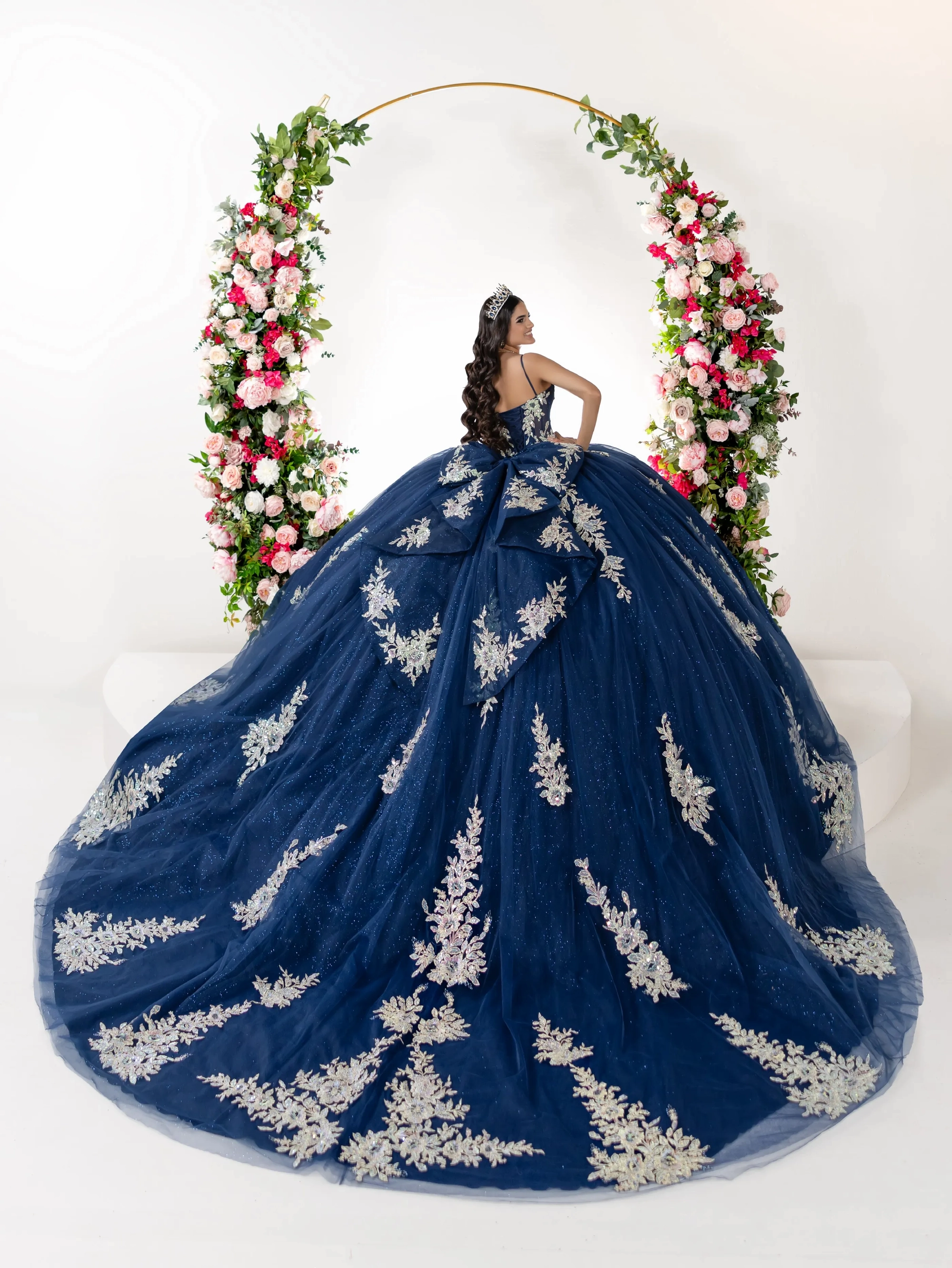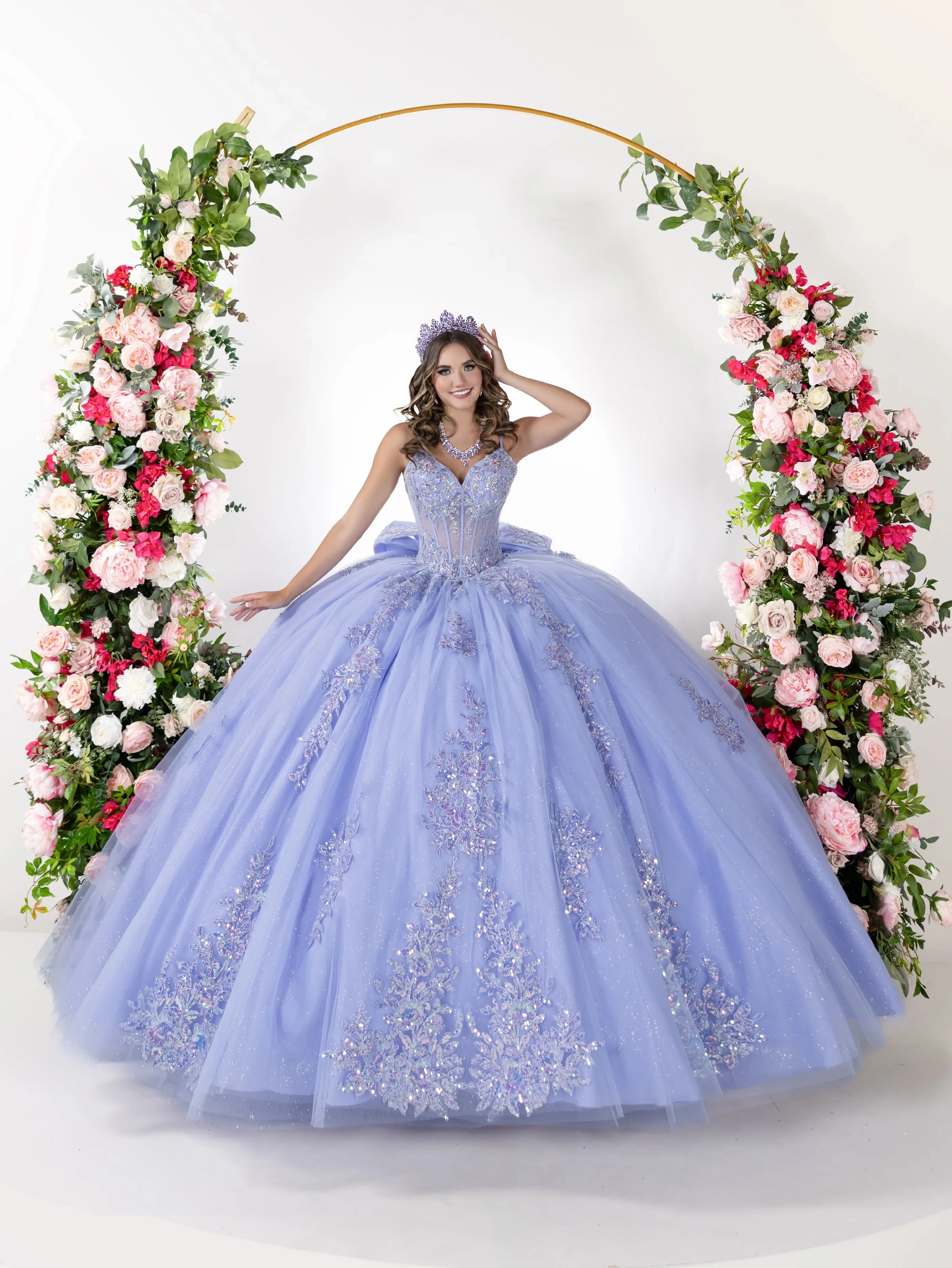 This enchanting ball gown is designed with a sparkling sweetheart neckline and supportive thin straps, offering a modern yet timeless silhouette. The bodice features a fitted corset style with shimmering glitter tulle, embellished with intricate beaded floral appliqués in soft pastel hues. The full ball gown skirt flows outward with grand volume, covered in dazzling floral motifs and glimmering details that catch the light from every angle. The soft lilac color adds a dreamy, princess-like aura. The back of the gown is breathtaking, highlighted by a dramatic oversized bow at the waist that cascades gracefully over the skirt. The long, sweeping train is adorned with the same delicate floral embroidery and glitter patterns seen in the front, creating a seamless and magical design. The back neckline dips into a soft scoop, maintaining a comfortable fit while enhancing the regal feel of the gown.
